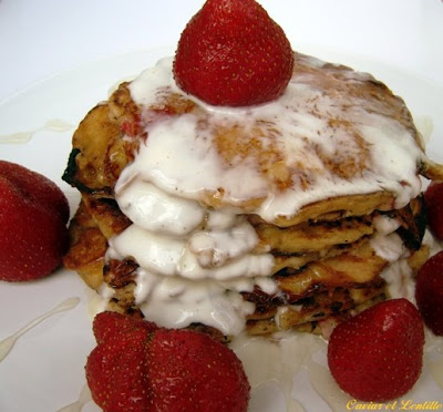 Az előző este elkészített ricottát reggel összekevertem 4 tojás sárgájával, a cukorral, vaníliával, liszttel, sütőporral, cirtomhéjjal és végül a csipet sóval felvert tojáshabbal. Belekevertem 25 dkg kicsire vágott epret és vajon kis kerek palacsintákat sütöttem. Mézzel édesített tejföllel öntöttem le és epreket szórtam köré.