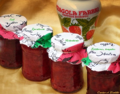 Következett a rebarbarás eperdzsem. Ennél 2 kg eperhez 1 kg rebarbarát és 80 dkg Dr. Oetker 3:1 befőző cukrot tettem. A rebarbarát meghámoztam és 1 centis darabokra vágtam, hozzákevertem az epreket, az cukrot és kicsit összenyomkodtam a kezemmel. Főzni kezdtem, mikor a rebarbarák már szétestek fölforraltam és még kb. 5 percig főztem. Gyorsan üvegekbe mertem, aztán 5 perc fejre állítás után ezeket is dunsztba tettem.