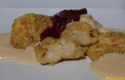 Az egyik lapra kb. 5 centinként ricotta halmokat csináltam, majd rátettem a másik tészta lapot. Körben, minden oldalról lenyomogattam és éles késsel kivágtam a négyzeteket. Ezután még jól lelapogattam a széleit, hogy főzés közben biztosan benne maradjon a töltelék és lisztezett tálcára halmoztam. Aztán ugyanígy tettem a másik 2 lappal. Feltettem a vizet főni, közben vajon zsemlemorzsát pirítottam, amibe beleszórtam a végén egy vaníliás cukrot is. A víz tetejére helyeztem egy másik lábost, amiben tojássárgájából, tejből, cukorból, lisztből, vanília eszenciából sodót kevertem. Közben felvertem a tojások fehérjét egy csipet sóval és a kész vaníliás mártáshoz kevertem. A tésztákat a lobogó vízbe tettem. Mikor feljöttek a víz tetejére leszűrtem és összekevertem a morzsával. A vanília sodóval és eperdzsemmel tálaltam. Miközben életem párja falatozott, én elmerengtem, hogy miért is nem hallgatok Anyukámra és dőlök inkább a kardomba, semmint hogy ilyesmiket készítek miközben én 600 kalórián tengődöm :).