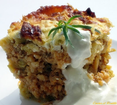 A darált pulykahúsból pörköltet készítek. Az apróra vágott hagymát kevés olajon megfuttatom, hozzádobok egy-egy felaprított paprikát és paradicsomot, szórok rá kevés édes pirospaprikát, ráteszem a húst, sózom, borsozom, reszelek rá fokhagymát, adok hozzá egy csipetnyi őrölt köményt, aztán hozzáöntök egy csésze rizst és végül öntök alá annyi vizet, hogy ellepje. Fedő alatt 15 percet főzöm, aztán leveszem a tűzről, jól betakargatom és hagyom párolódni, hogy a rizsszemek magukba szívhassák a pörkölt szaft egy részét. Közben a zsenge vajbabot megpárolom. Mikor mindezzel megvagyok egy nagyobb jénait kivajazok és rétegezve lerakom a zöldbabbal kezdve és befejezve. A tetejére tejfölt és valamilyen semleges ízű reszelt sajtot teszek és 180 fokon addig sütöm, míg a sajt egy kis színt kap.