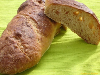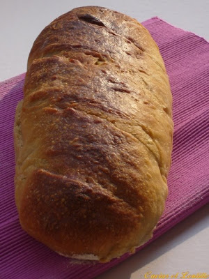 Kettészedem a tésztát és hosszúkásra formázom, úgy hogy először 2 kerek cipót csinálok belőle, majd 10 perc pihentetés után oválisra lapítom. A “sarkait” a közepe felé hajtom,így kapok egy lekerekített szélű négyzetet átlókkal, aztán félbehajtom, a hajtást lefelé fordítva görgetem a deszkán, hogy a végei kissé elvékonyodjanak. Letakarva 3 órát pihentetem, hogy még egyszer duplájára nőhessen. Aztán bevágom, megspriccelem vízzel és 220 fokra előmelegített sütőbe helyezem lisztel beszórt sütőlapra, egymástól 10 cm-re. 20 perc után csökkentve a hőmérsékletet 190 fokra újabb 20 percig sütöm. Rácson hagyom kihűlni. A recept a Szakácsok könyvéből van, ahonnan az az ötlet is, hogy a sütő aljába egy tepsi jégkockát teszek a kenyérrel egyidőben, hogy biztosítsam a nedvességet a sütés ideje alatt.