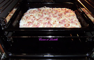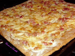 Az elősütött tésztát megkenem a fokhagymás tejföllel, rászórom a szalonna kockákat, a hagymakarikákat és a reszelt sajtot. Visszatolom a sütőbe és addig sütöm, míg aranyszínűre nem sül a sajt.