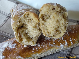 Az élesztőt beleszórom a vízbe, adok hozzá egy kevés cukrot és pár percet pihentetem. Közben a lisztet egy tálba szitálom. Hozzáöntöm az élesztős vizet, a sót és az olaj, olvasztott vaj keverékét. Alaposan összegyúrom, legalább 10 percig, aztán langyos helyen, letakarva 2,5 órát pihentetem. Ezután újra alaposan átgyúrom, Julia Child után szabadon odacsapkodom jó párszor az asztalhoz, 3 részre szedem, formázom. ( ellipszis formára lapogatom a kezemmel, aztán hengerré tekerem és az asztalon görgetem, míg egyenletes hengert nem kapok ). A csapkodás fantasztikus feszültség levezető és nem utolsó sorban a kenyértésztának is jót tesz 🙂 Lisztezett baguette sütő formába helyezem őket és még fél órát kelesztem. Előmelegítem a sütőt 240 fokra. Bevágom a baguette-ket és megkenem a tetejüket kevés vízzel elkevert tojássárgával. Ezt a lépést gyakorta kihagyom és ilyenkor a rajtamaradt liszttől szépséges, rusztikus kenyérkéim születnek. Beteszem a sütőbe és beöntök 1 pohár hideg vizet a sütő aljába, aztán gyorsan becsukom az ajtaját. Ha valaki tart ettől a művelettől, az nyugodtan tegyen egy kisebb tepsit és öntse abba vizet vagy tegyen egy tepsi jégkockát a sütőbe. A lényeg, hogy valahogy gőzt csináljunk. Nagyjából 15-18 perc alatt aranybarnára sütöm őket. A sütési idő növelésével szoktam játszani, attól függően mennyire ropogósra szeretném épp. A maximum 25-30 perc lehet. Rácsra teszem hűlni.