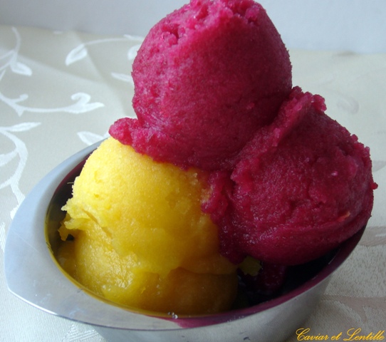 Ez már a forró nyári napokra készülvén született. Félérett mangó a legjobb hozzá, mert az már kellően édes, de még megvan az a kellemes savanykás íze is, ami igazán jól érvényesül ebben a jéghideg frissítőben. Nekem a thai mangóval a csúcs, de a bárhol kapható mangóból is fantasztikus! A színe pedig a cékla sorbet-ével vetekszik. Nem is tudtam ellenállni egy közös fotónak! 🙂