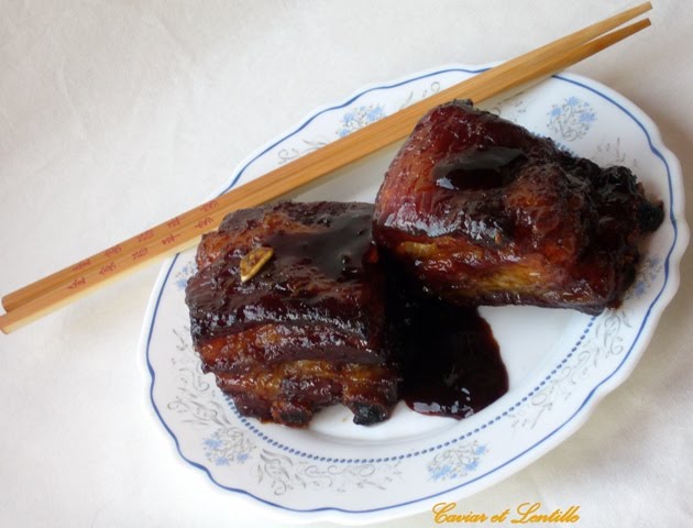 Ha valaki, hozzám hasonlóan mégis a oldalas verzió mellett dönt, akkor igyekezzen húsos, de ugyanakkor kövér oldalast beszerezni. Ezt előző nap feldaraboltam úgy, hogy 2 csont jusson egy darabba, aztán szójaszószból, reszelt gyömbérből, mézből és reszelt fokhagymából pácot készítettem, amiben másnapig a hűtőben csücsültek a húsok.