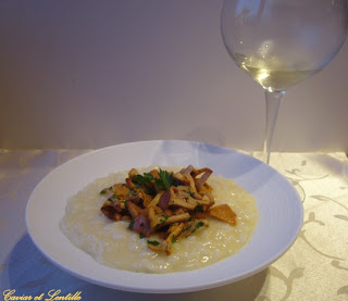 Ezután elkészítettem a rizottót. Az egészen apróra vágott hagymát vajon megfuttattam, óvatosan, hogy színt ne kapjon. Ezután ráöntöttem a rizst, majd 1-2 perc után hozzáöntöttem a bort. Folyamatosan kevergettem és mikor elfőtt a bor elkezdtem merőkanalanként hozzáadagolni a forró alaplét. Nagyjából 20 perc elteltével elfogyott az alaplém és al dente-ére főtt a rizs. Ekkor sóztam, mert nálam az alaplé teljesen sótlan. Gyorsan belekevertem a frissen reszelt parmezánt és a jéghideg, felkockázott vajat. 1 percre félrehúztam pihenni. Addig a gombát felforrósítottam, megszórtam összevágott petrezselyemmel és tálaláskor a rizottó tetejére halmoztam.