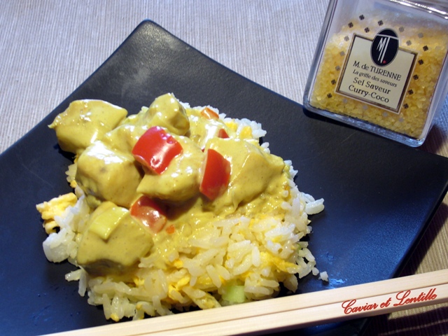 Papírtörlőn megszárogattam, majd forró mogyoróolajban pirítottam 1-2 percig, aztán folpackba csomagolva félretettem. 10 perc elteltével visszadobtam a forró serpenyőbe, hozzáadtam a nagyobb kockákra vágott hagymát és 5-6 percig rázogatva sütöm. Megszórom kurkumával és ráöntöm a keményítővel elkevert kókusztejet. Beleszórom a kimagozott, apróra vágott chilit és addig főzöm, míg be nem sűrűsödik.
