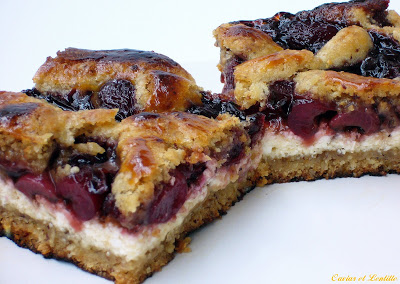 Egy tepsibe sütőpapírt tettem és belenyomkodtam a tészta kétharmadát. Először a túrót tettem rá, majd a cseresznyét. A tetejére a maradék tésztából rácsot formáztam. A rácsokat megkentem 1 tojás sárgájával és előmelegített sütőben 180 fokon 30 percig sütöttem.